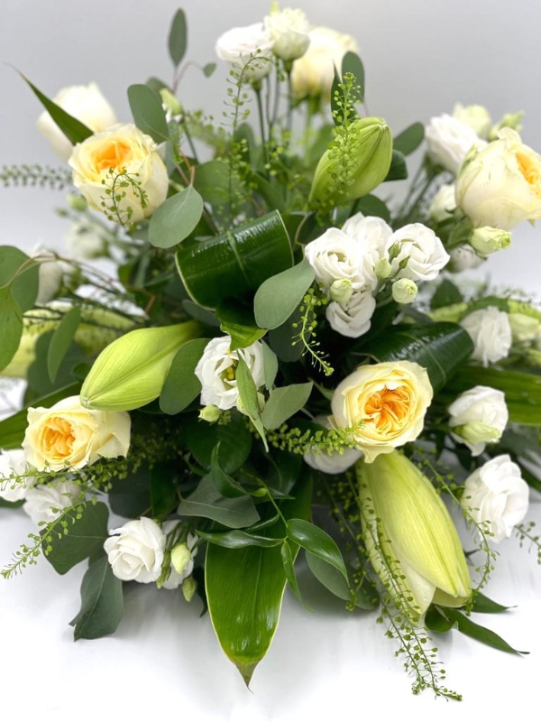 A traditional sympathy posy in soft neutral shades.