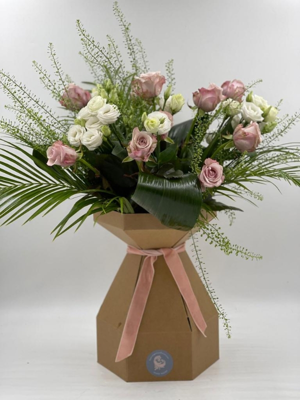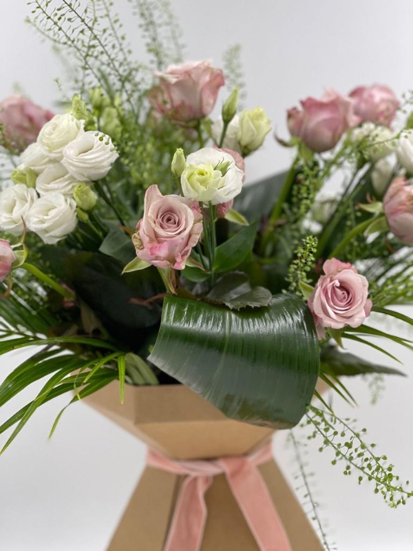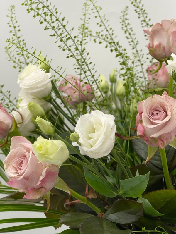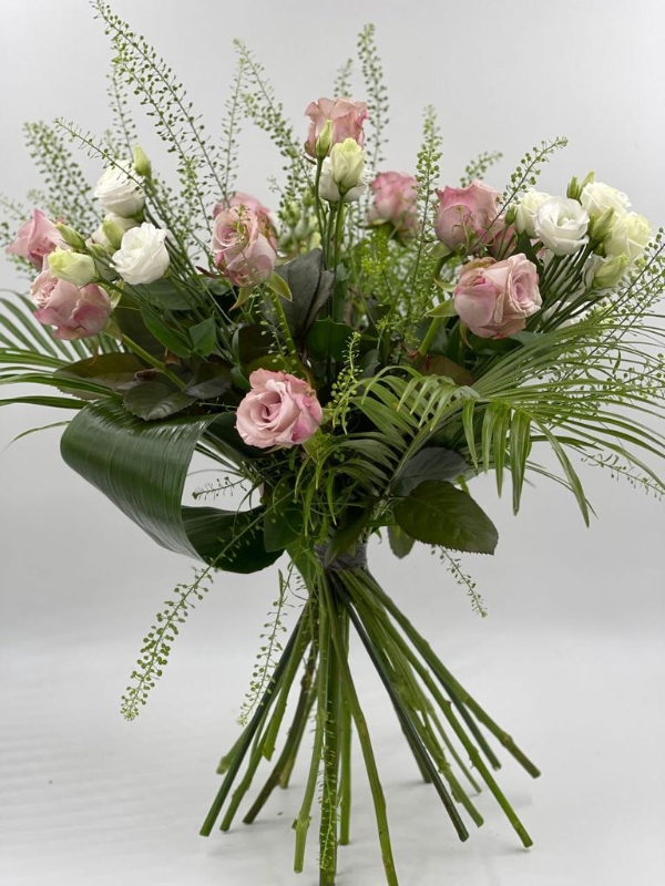 Includes roses, lisianthus and soft flowing foliage.
