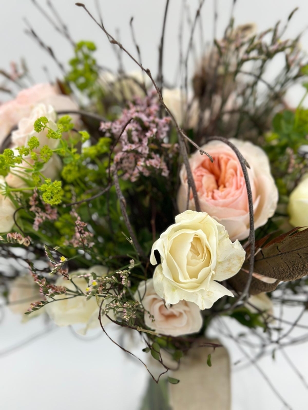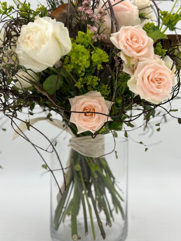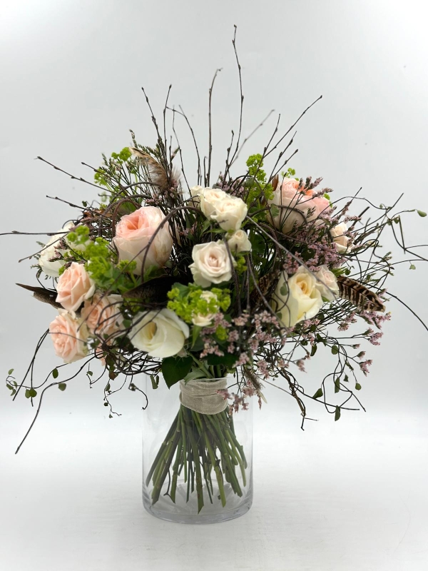 A perfect summery gift, a vase of summer blooms in a loose and flowing design in soft pastel shades.