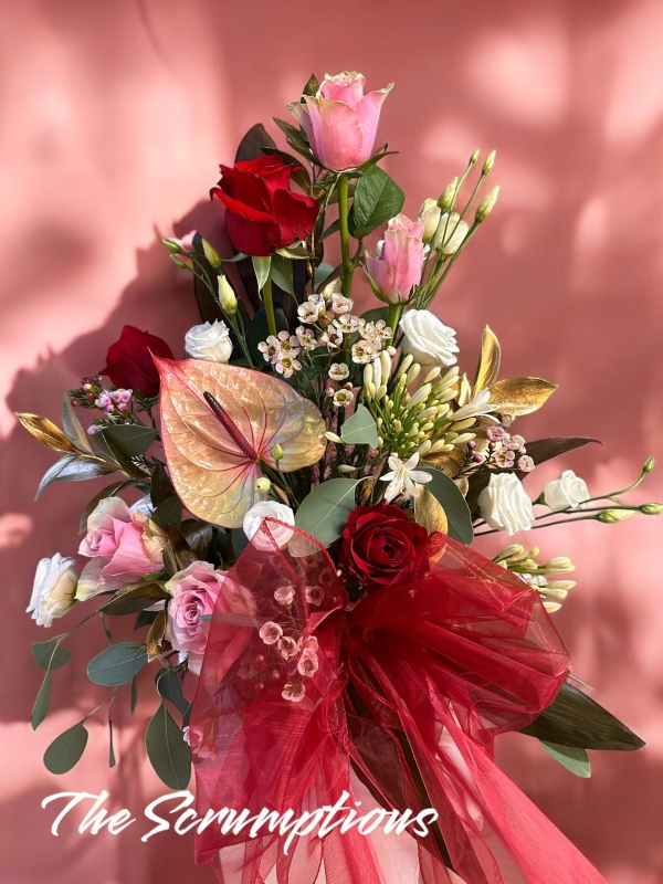 A truly beautiful Valentine arrangement set in a hat box filled with luscious blooms and adorned with a red taffeta bow.