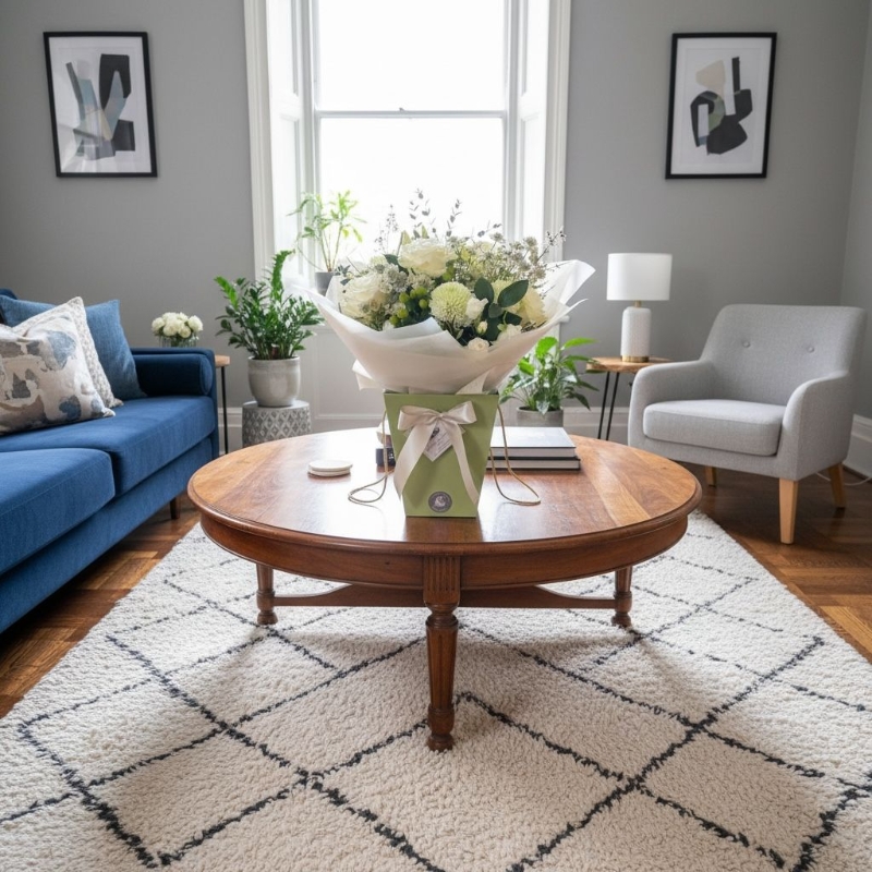 A sophisticated arrangement of white roses and specialist chrysanthemum blooms,